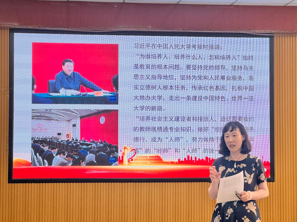 孙颜红以《新时代加强师德师风建设的着力点》为题讲党课。她讲到培养社会主义建设者和接班人,迫切需要我们的教师既精通专业知识,做好“经师”,又涵养德行,成为“人师”,努力做精于传道授业解惑的“经师”和“人师”的统一者。要突出政治标准的首要地位,明确职业道德的高线要求,丰富爱生情怀的深刻内涵,扩展学习践行的实践路径。要坚持政治引领,把师德师风建设摆在更加重要的位置,引导广大教师坚守立德树人根本任务,要学思想、见行动,做到内铸师魂,外塑师表。