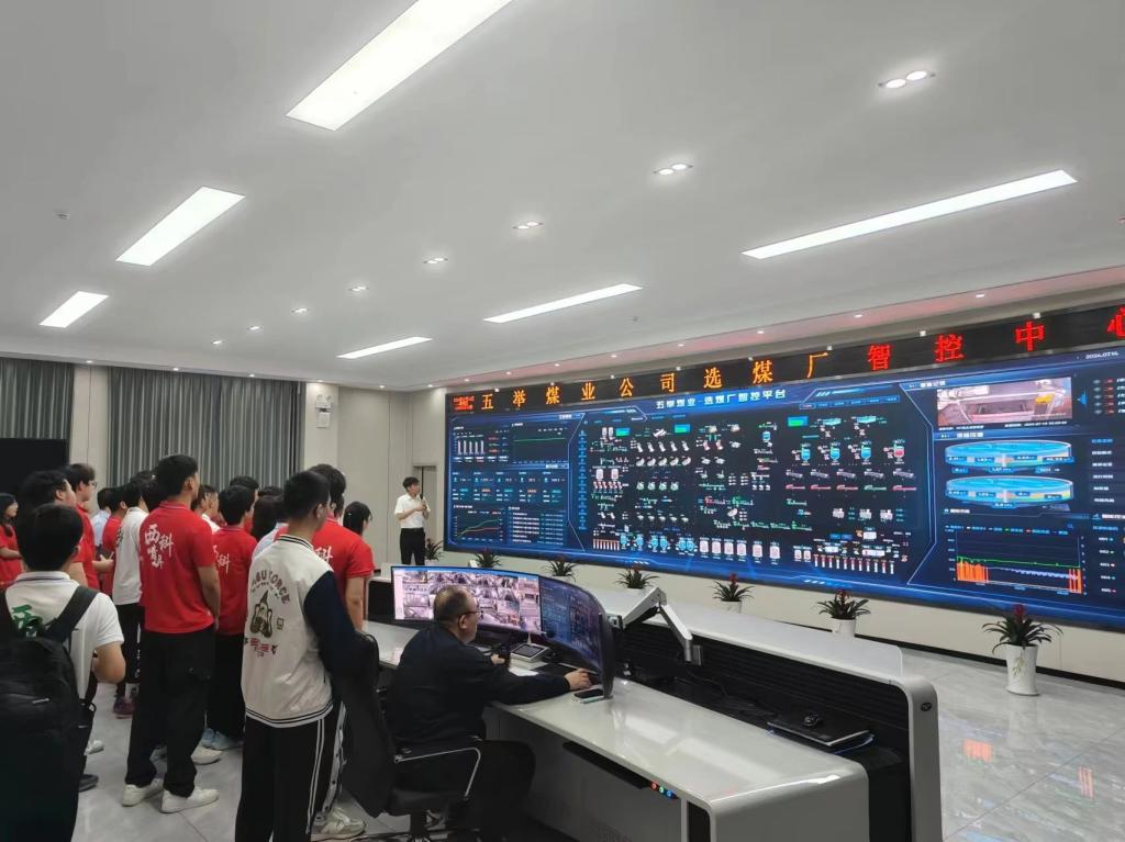 第一站,实践团师生来到了煤炭发运中心参观选煤厂智控中心。通过高清大屏和实时数据展示,智控中心生动呈现了煤炭从原煤到精煤的全自动化、智能化处理过程。工作人员详细介绍了选煤工艺、设备运行及智能监测系统的应用,让同学们深刻感受到了科技在提升煤炭品质、优化生产流程中的巨大作用。