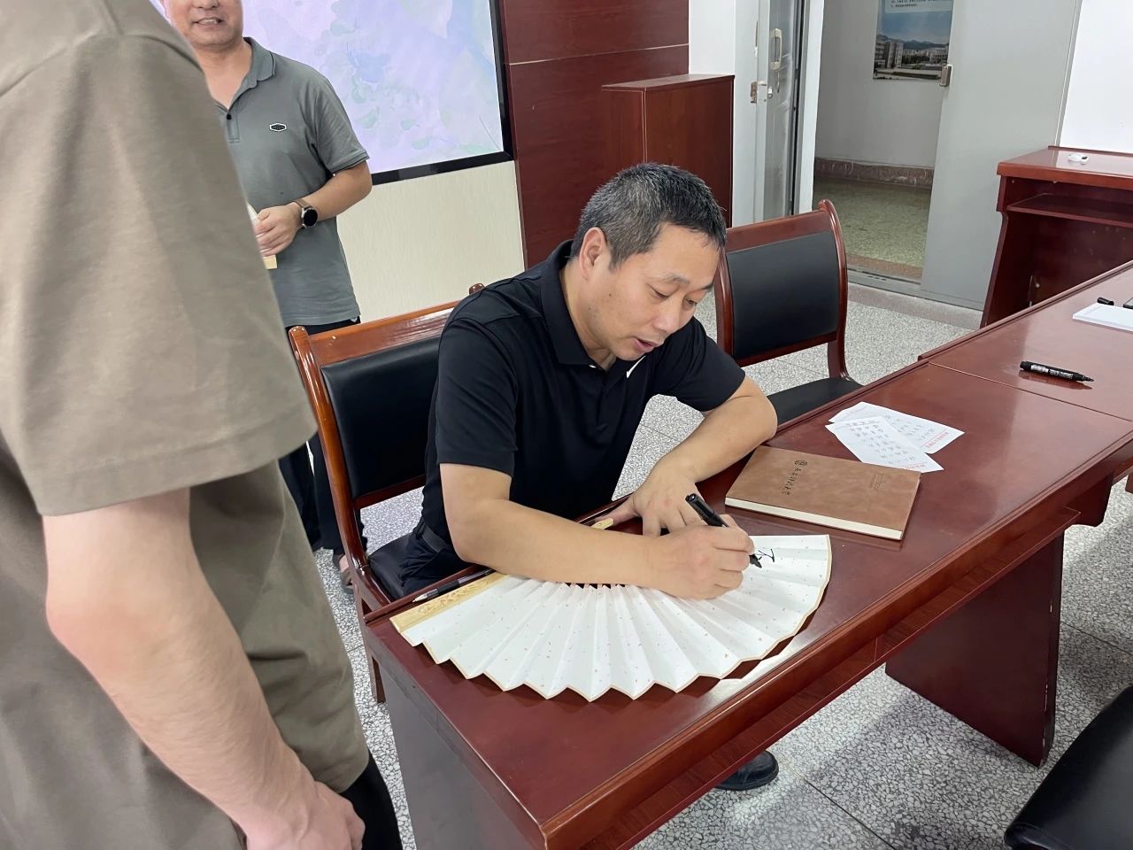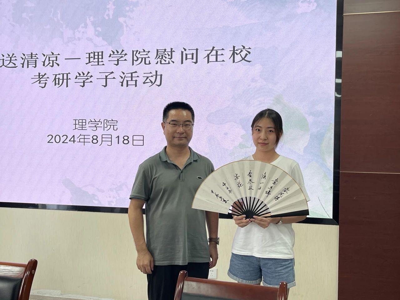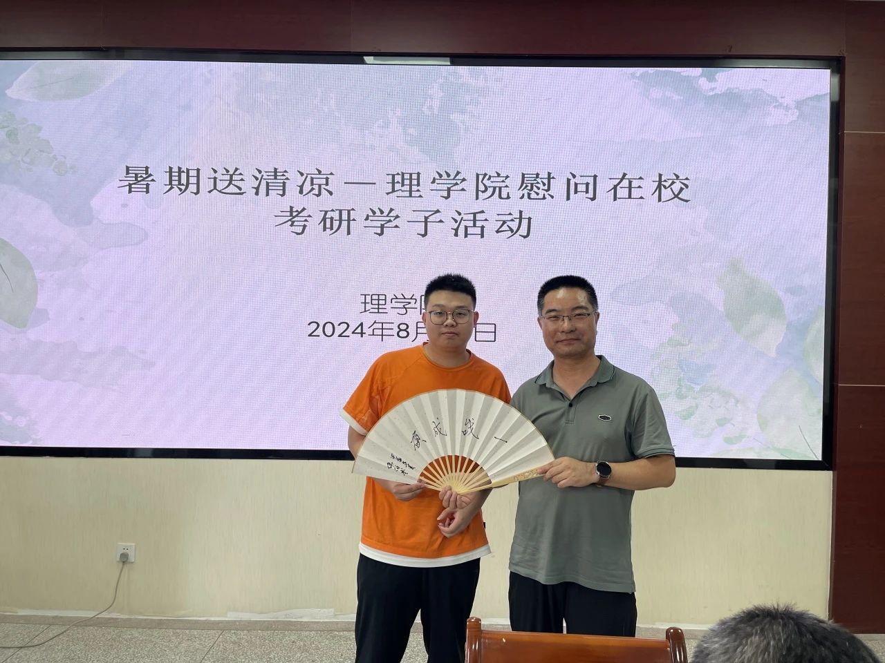 在220会议室内,我院院长张仲华、院副党委书记陈伟伯、院团委书记侯斌刚携带精心准备的扇子,亲手将这份特别的礼物递送到每位在校考研学子的手中。这些扇子不仅设计精美,更蕴含着学院对学子们的深情厚谊与美好祝愿。