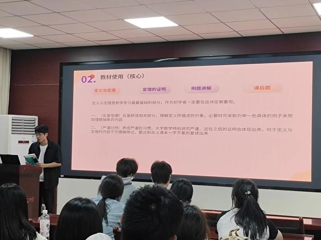 为帮助2024级新生更好地适应大学生活,明确学习目标,掌握专业课高效的学习方法。我院学习部于9月24日在220会议室组织了一场面向2024级数学专业本科新生的专业课学习经验交流会。本次交流会邀请了数学专业2301班优秀学生代表汪夏禹作为主讲人,他向新生们分享了自己在《数学分析》与《高等代数》两门主干课程学习上的心得和宝贵经验。