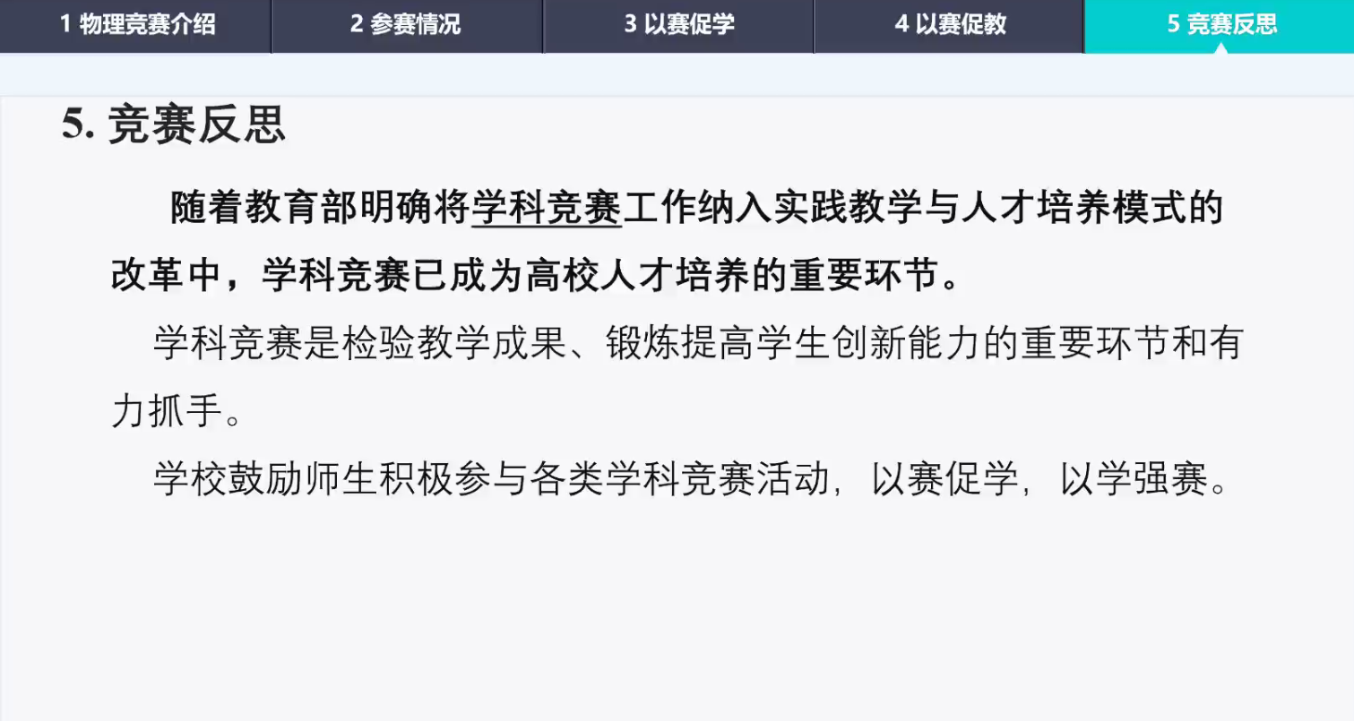 物理系教师闫小乐副教授做了“以赛促教,提升大学物理教学水平”的专题报告。闫老师首先介绍了中国大学生物理学术竞赛(CUPT)和全国大学生物理实验竞赛(创新)两项物理类全国性大学生竞赛的赛制;我校学生的参赛情况和获奖情况。重点分享了竞赛团队老师在以赛促教、以赛促学等方面举措、典型案例和思考。学科竞赛能够促进学生实现全面发展,特别是学生的团队协作意识、文献阅读能力、实验设计及操作能力、理论建模能力、演讲和研讨能力能够得到极大提升。物理系教师积极参与交流讨论。大家一致认为,物理学科竞赛是在掌握基本理论知识和一定的实验方法、技能的基础上,以竞赛的方法激发学生理论联系实际和综合运用的能力,是课堂教学与实践创新的重要纽带,是高等学校教学过程中实现素质教育和创新人才培养目标的重要手段。在竞赛中,师生协作奋进、攻坚克难,尤其是指导教师的言传身教和价值引领,激发了学生浓烈的探究欲望和坚强意志。教师在指导学生的过程中也不断提升了教育教学技能,促使教师深入思考物理课程教学改革的思路、方向和实践。