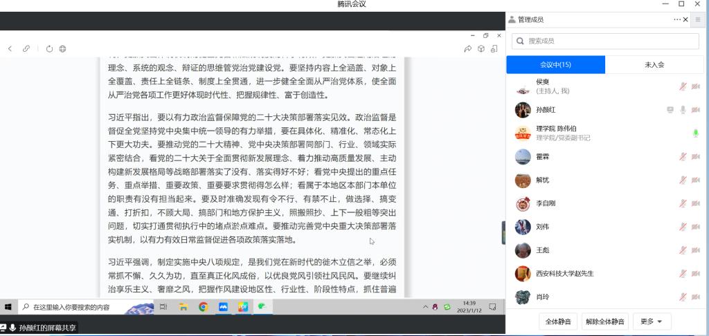 会议集体学习“习近平在二十届中央纪委二次全会上发表重要讲话”、“陕西省教育厅办公室关于6起教师违反职业行为十项准则典型问题的通报”等。张仲华、解忧、李自刚就落实党的二十大精神、二十届中央纪委二次全会精神,做好本学期教学收尾工作及持续推进教学、科研、学科建设等工作作安排部署。陈伟伯重申了学校《关于严明2023年元旦、春节期间纪律要求的通知》精神,警示大家要锲而不舍落实中央八项规定精神,深化纠治“四风”,守住节日廉洁关。