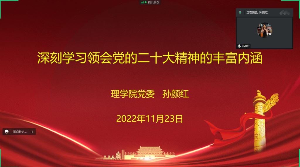 会议集体学习了党的二十大报告,孙颜红以“深刻学习领会党的二十大精神的丰富内涵”为题讲专题党课,从“深刻学习领会党的二十大精神的主要成果”等7个方面与全体教职工分享个人学习心得。她讲到学习宣传贯彻党的二十大精神,要准确把握党的二十大对教育的定位和要求,要与落实“立德树人”根本任务相结合,与落实校第十一次党代会提出的新“三步走”发展战略和“七大工程”相结合,与教育教学改革实践相结合。孙颜红强调,目前正值支部换届期,各党支部要切实担起政治责任,精心安排、周密部署,确保工作不间断,迅速兴起学习宣传贯彻党的二十大精神的热潮。