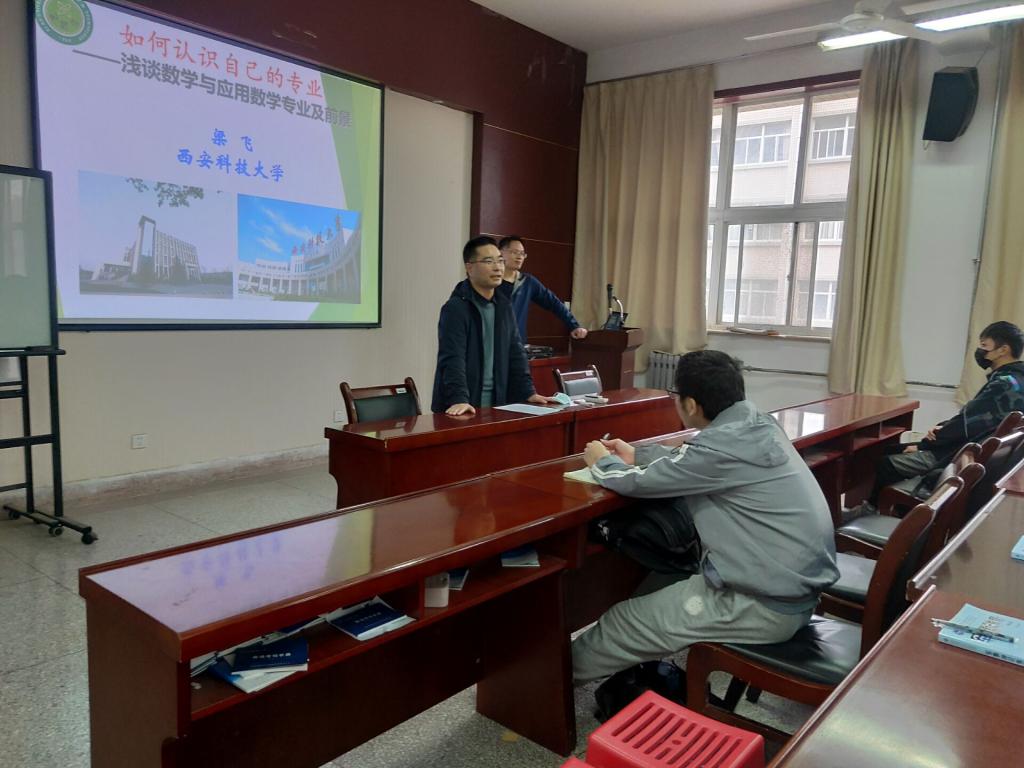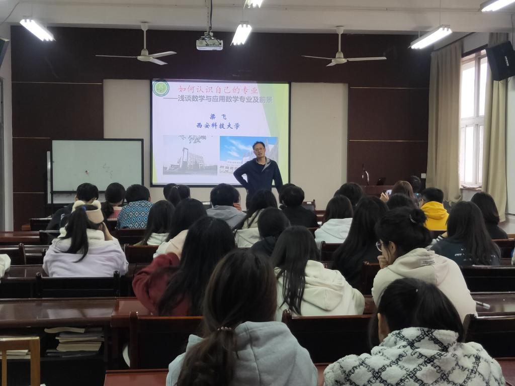 讲座中,梁飞老师详细讲述了数学专业的课程内涵及未来考研就业的不同方向,同时以本人求学生涯为例,向学生们提出两点建议:一是要珍惜时间,努力学习,打好专业基础;二是要做好职业规划和学涯规划,尽早明确就业和考研方向。