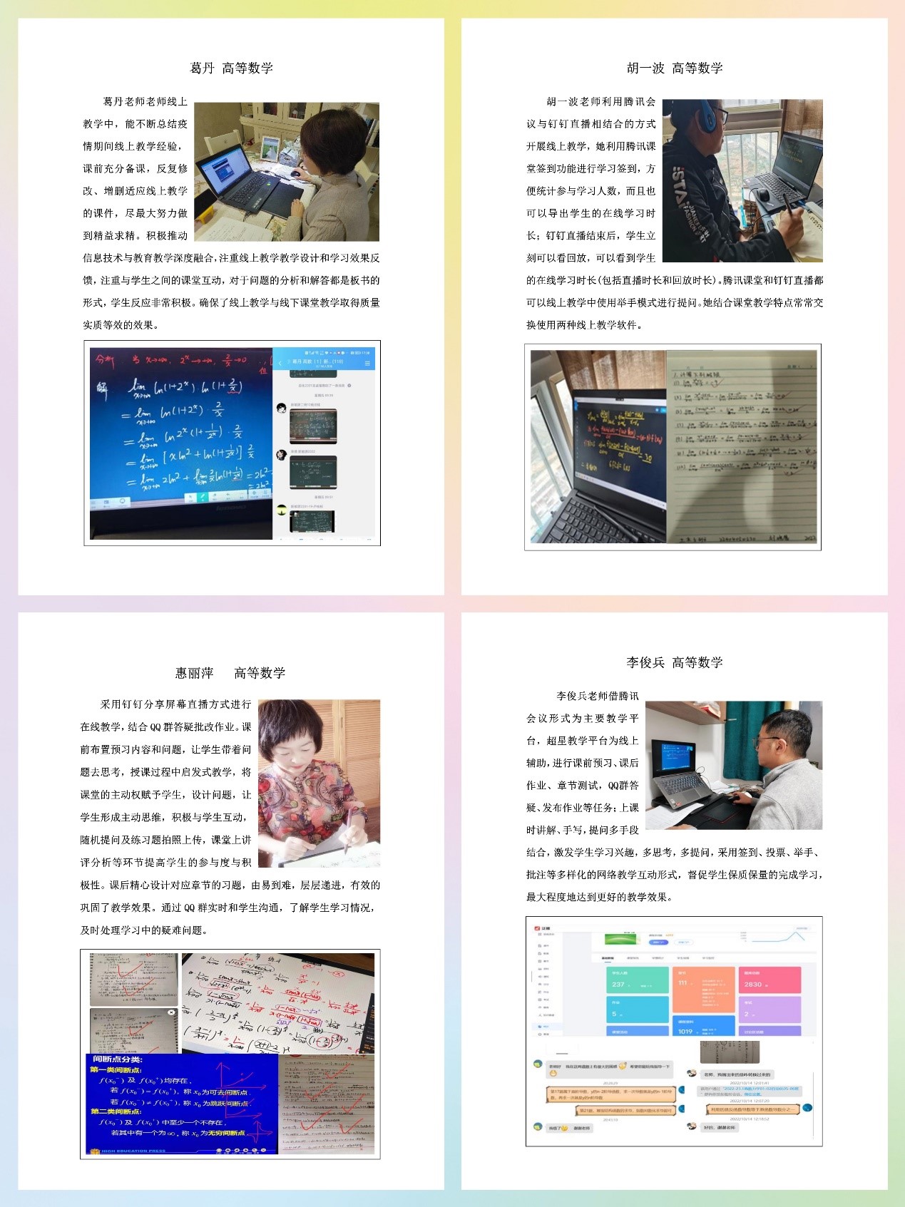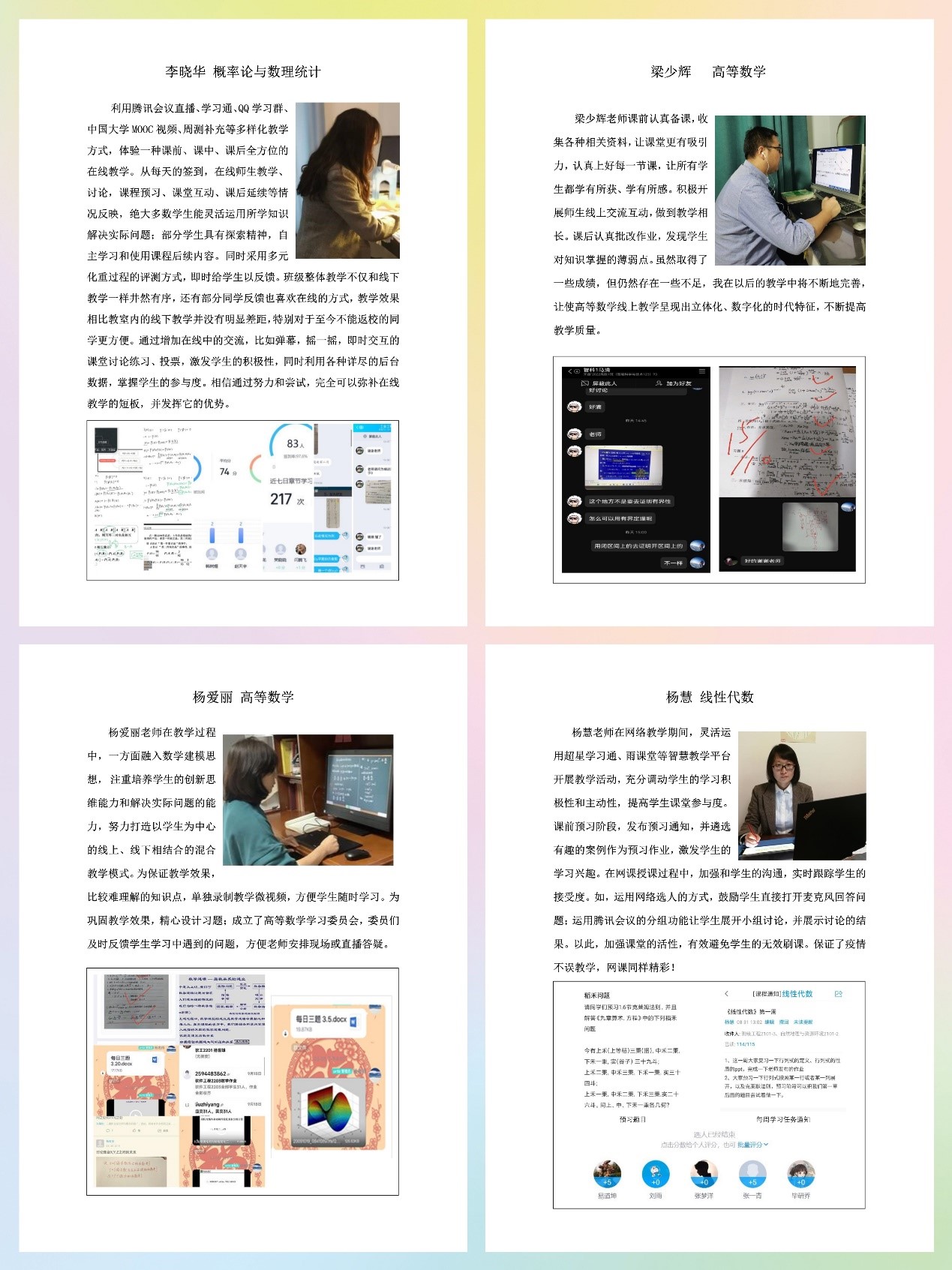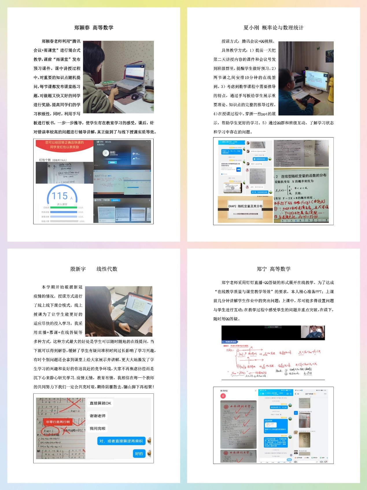 面对疫情,数学系第一党支部全体教师沉着应对,按照教学计划,迅速调整教学方式,坚持以学生为中心开展丰富多样的线上教学活动,学生自主讲解、教学视频展示、专题讨论相结合,让学生参与教学,沉浸于课程学习,在线教学工作开展顺利。