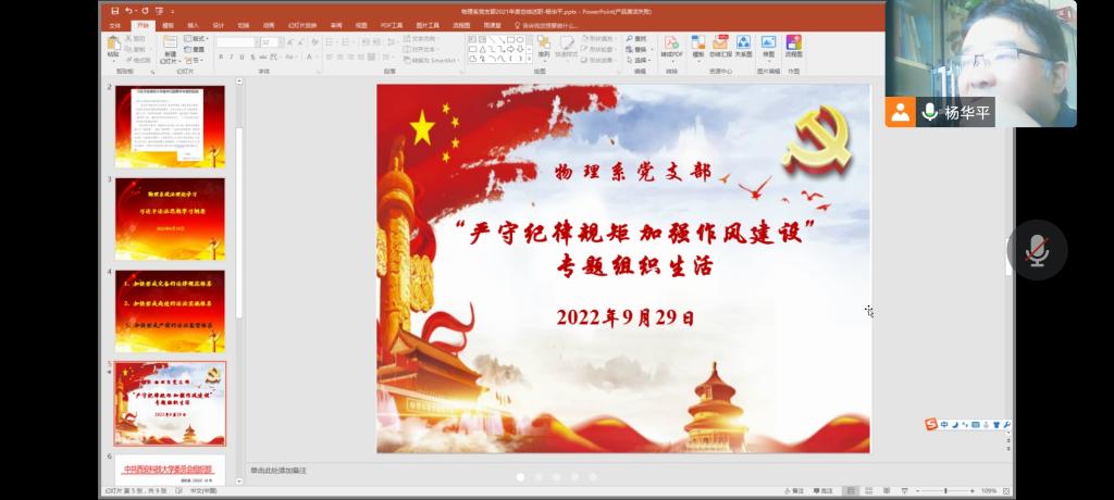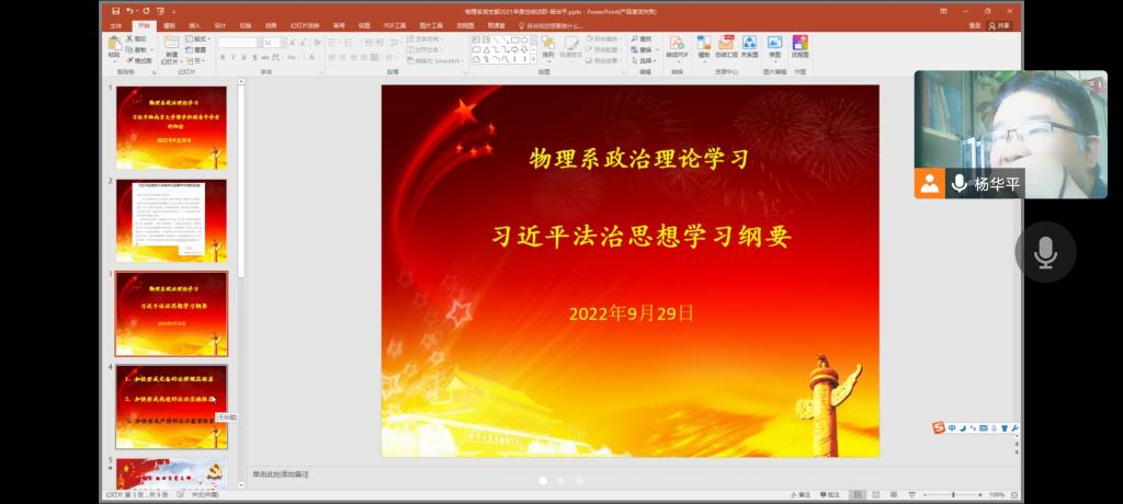 9月29日上午,AC米兰中文物理系党支部以腾讯会议平台召开“严守纪律规矩,加强作风建设”专题组织生活会。会上,大家集中学习了《习近平谈治国理政》第四卷、《习近平法治思想学习纲要》等。支部书记杨华平首先代表支部向所有党员通报了支部查摆问题的情况,指出了存在的问题和差距,并提出相关整改措施。之后,每位党员结合各自的政治理论学习和工作实际逐一进行自我评价,开展批评与自我批评,并对支部作风建设提出意见和建议,会议气氛热烈。
