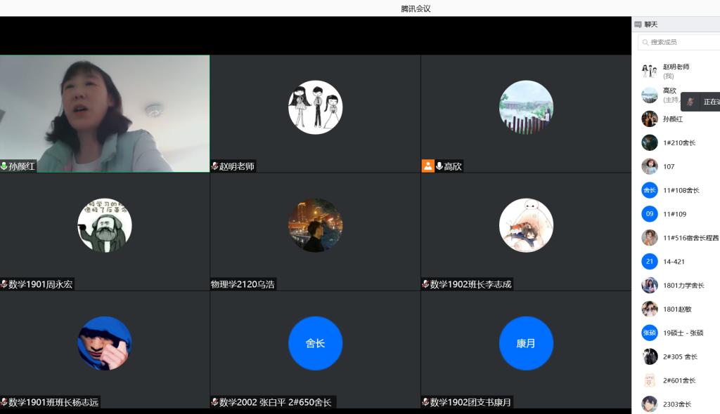 首先,辅导员赵明、侯斌刚就目前西安市疫情形势做了通报、就近期学校防疫的要求进行了强调说明。党委副书记高欣对全体学生党员、学生干部提出三点要求:一要增强政治意识和责任意识,带头抗疫听指挥;二要增强团体意识,要求各班长、舍长认真督促本班级、同宿舍同学落实各项防疫要求,关心帮扶班级同学。三要增强应变意识,在疫情面前增强主动学习的能力。