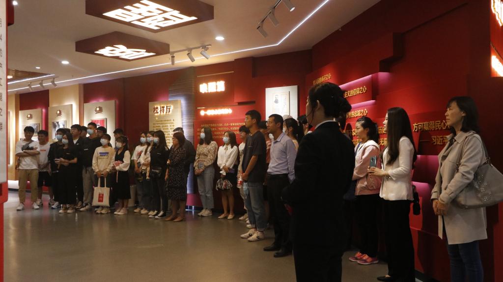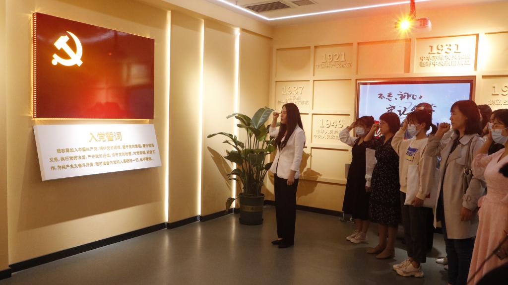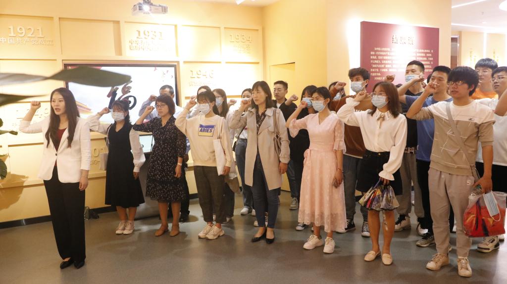 师生们跟随讲解员的脚步依次参观序厅、启程厅、榜样厅、传承厅、初心课堂和启迪厅,认真聆听了从南湖红船开始的革命故事,以及西迁精神、抗疫精神等六个篇章的内容。最后,在党委副书记高欣的领誓下,师生党员们面对党旗,一同重温了入党誓词,在这庄严而神圣的时刻,每一位党员都不禁回想起最初的信念,且更加坚定了心中的信仰。