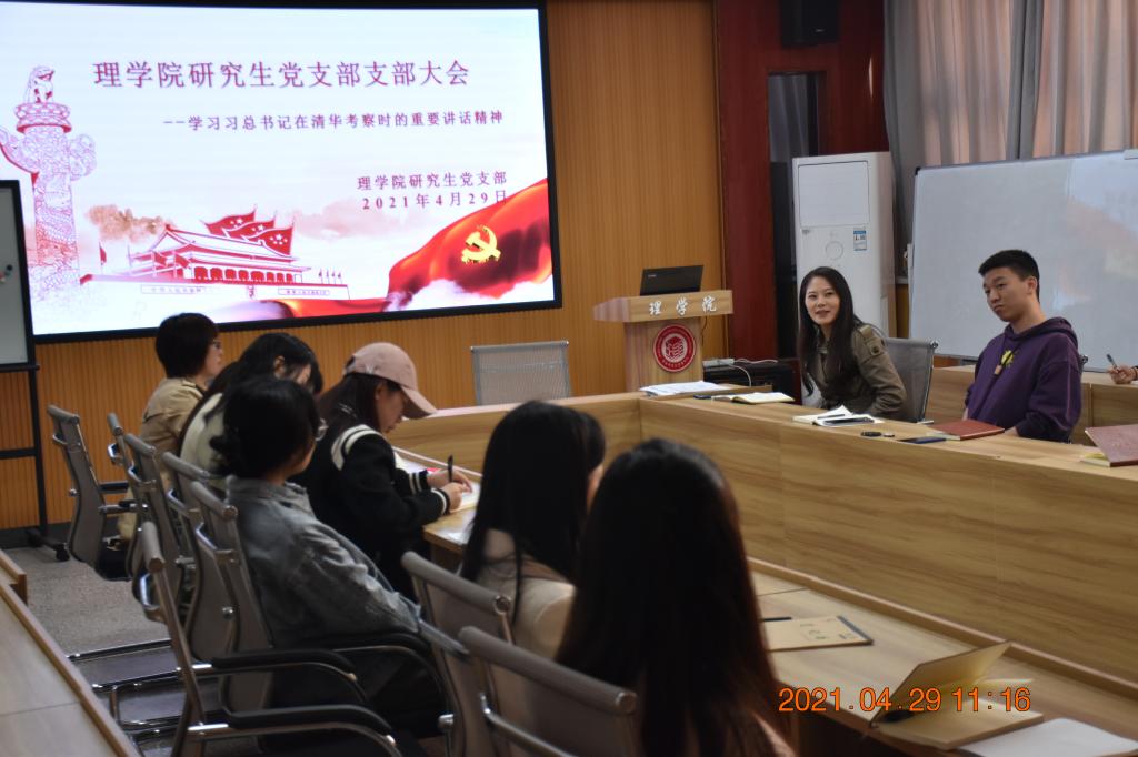 为进一步贯彻落实党史学习教育工作,推动全党深入学习领会习近平新时代中国特色社会主义思想,2021年4月29日上午,AC米兰中文党委副书记高欣、研究生党支部书记行珊带领全体研究生党员在AC米兰中文会议室举办“学习习近平总书记在清华大学考察时的重要讲话精神”主题党日活动,会议开始之初,首先学习了习近平总书记在清华大学考察时发表的重要讲话精神,大家深刻感悟到广大青年要肩负历史使命,努力成为堪当民族复兴重任的时代新人,让青春在不懈奋斗中绽放绚丽之花。之后,党员同志们一起观看了习近平总书记在清华大学考察的学习视频,视频结束之际,党委副书记高欣表示我们身为“生逢盛世,肩负重任”的一代大学生,身为学生党员,更应该脚踏实地,成为能肩负时代历史使命的时代新人。