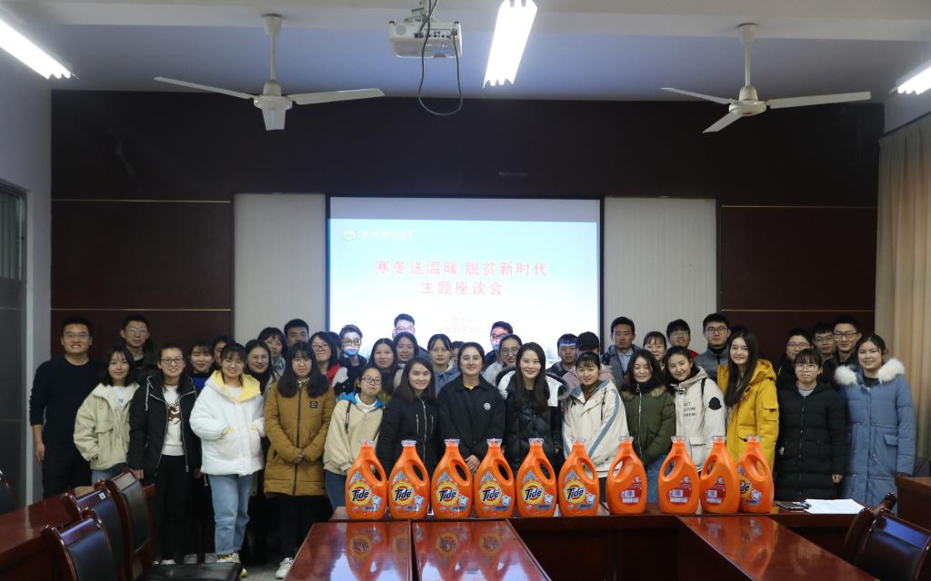 首先,赵明传达了学校“寒冬送温暖”工作精神,并带领大家学习了人民网文章《解读习近平“教育扶贫观”》。接着,师生之间进行了交流互动,学生们从在校学习生活情况、存在的困难困惑及对学校和学院工作的意见建议等方面进行发言,老师们对大家提出的问题一一进行回应解答,当时不能解决做了记录以便后续处理。随后,高欣做了总结讲话,提出了希望,并对大家普遍关心的英语学习和考研问题进行了重点指导,讲解了研究生奖助学金等相关资助政策,鼓励大家早做准备、坚持行动、通过学习深造改变家庭命运。最后,进行“寒冬送温暖”慰问品发放,并合影留念。