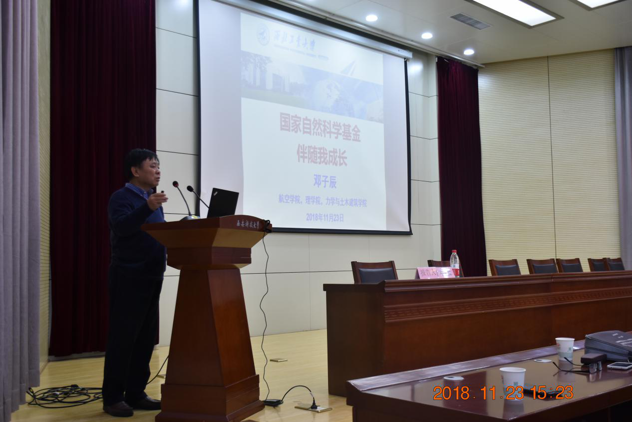 首先,邓教授结合自己申请国家自然科学基金的经验和感受,分享了他对国家自然科学基金的认识。其次,邓教授分析了现阶段国家自然科学基金申请的形式和特点,并强调必须重视基础研究和青年人才的培养。随后,邓教授介绍了西北工业大学AC米兰中文特别是力学学科申请国家自然科学基金的宝贵经验和取得的成效。最后,邓子辰教授对国家自然科学基金项目申请书的撰写予以具体指导和建议,并鼓励在场教师把握当下、提早准备、严谨认真地申请。
