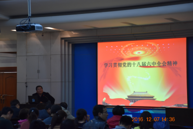 邀请我校马克思主义学院李禾俊老师作了报告。期间,李老师从十八届六中全会的重大意义、坚定不移的推进全面从严治党、全面加强和规范党内政治生活、全面落实党内监督责任等四个方面生动详细的为大家讲解了十八届六中全会的精神内涵。出席会议的各位教师积极响应,认真学习会议精神。