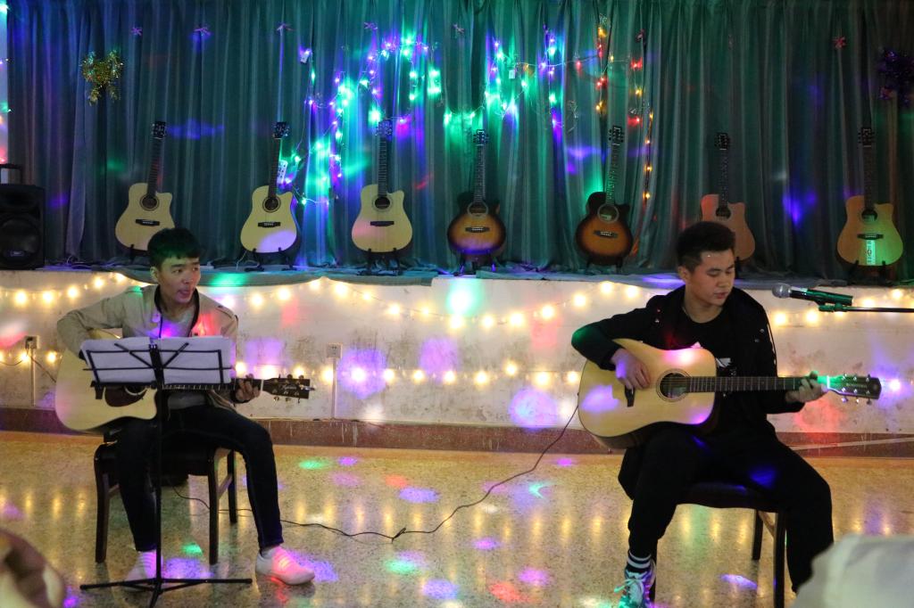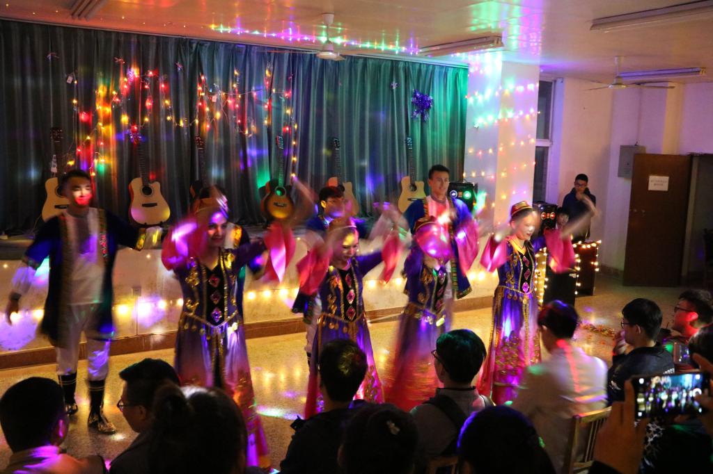游戏环节“有奖问答”和“抢红包赢奖品”带来的精彩互动让晚会气氛热烈。吉他弹唱、爱尔兰短哨与口琴合奏《美丽的神话》,美轮美奂,风姿多彩。学生会主席应全院学生的热烈要求上台为大家带来了动听的歌曲。