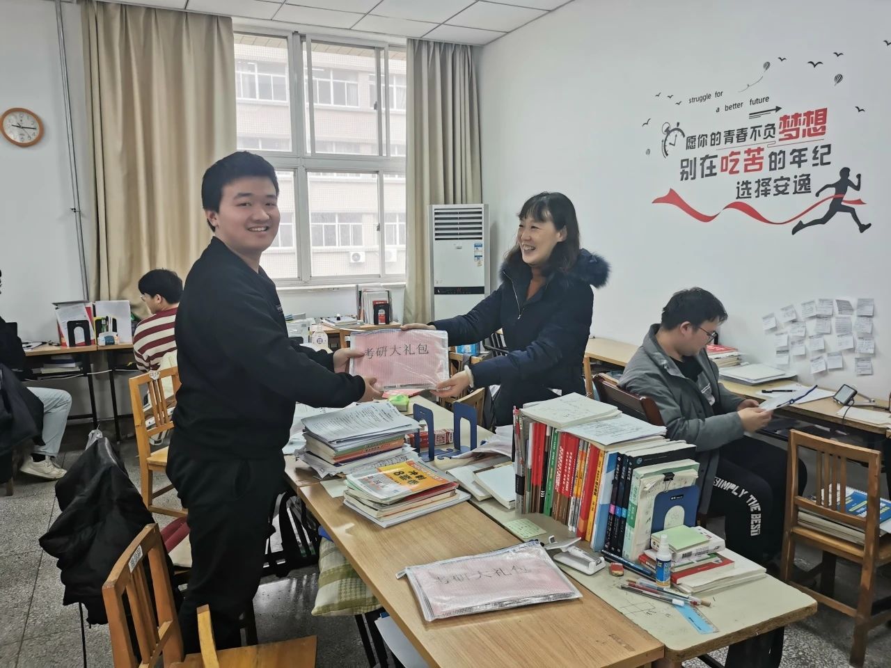 在送温暖的同时,老师们询问了考研的同学们目前的复习情况,并勉励他们把握好最后冲刺阶段,既要坚定信心,也要劳逸结合,保持稳定的心态,为自己的考研之路画上圆满的句号。同学们纷纷表示,听到老师鼓励的话语时,备考的紧张感一扫而空,纵使备考最后阶段很辛苦,他们也一定会带着学院的祝福坚持到底。