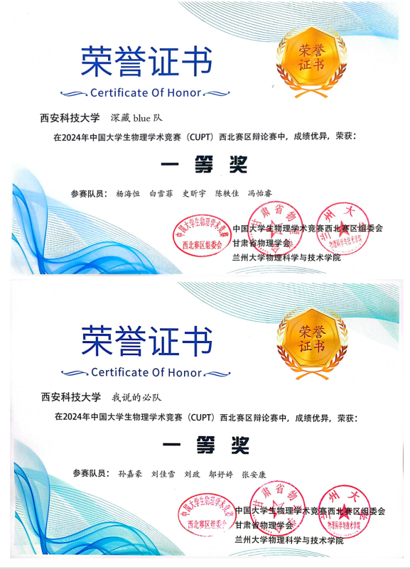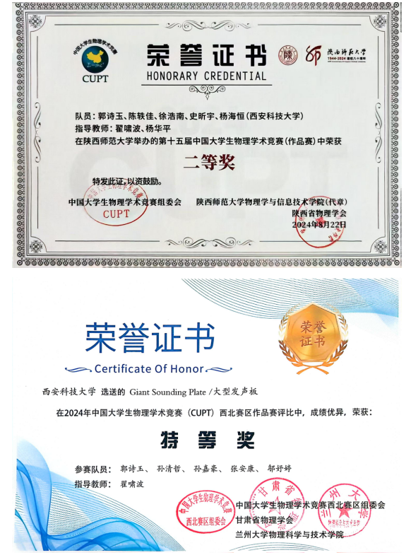 8月18日至23日,第十五届中国大学生物理学术竞赛在陕西师范大学长安校区举办。我校首次入围CUPT全国赛作品赛道(共28所高校),经激烈角逐,由翟啸波、杨华平老师指导的“大型发声板”作品脱颖而出,荣获“第十五届中国大学生物理学术竞赛(作品赛)”二等奖。CUPT全国赛包括团体赛和作品赛两个赛道,参赛高校需经过各区域竞赛遴选。此前,在西北区域赛中,我校荣获团体赛一等奖2项,作品赛特等奖1项,一等奖1项和二等奖1项的历史最好成绩,并获取了全国赛的参赛资格。