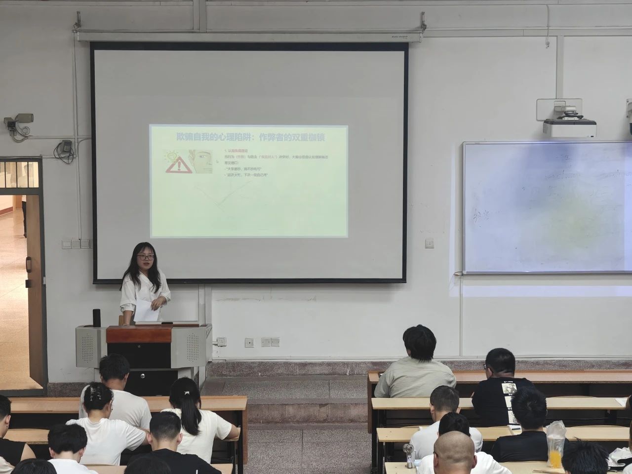 薛一丹针对四六级考试与期末考试诚信问题展开教育。她通报了近期高校考试违纪典型案例,重申《考场纪律守则》及违纪处理办法,并带领全体学生宣读诚信考试承诺书。她指出,诚信是立身之本,更是学术生命的根基。希望同学们以真才实学迎接检验,杜绝任何侥幸心理。
