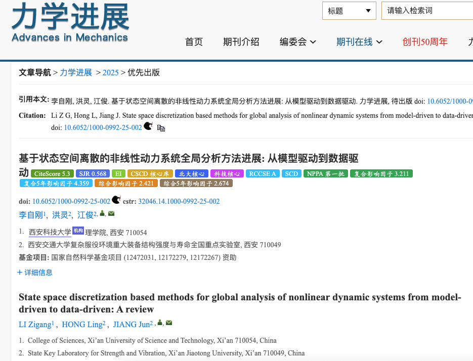 近日,AC米兰中文李自刚教授课题组与西安交通大学江俊教授、洪灵教授合作完成的综述《基于状态空间离散的非线性动力系统全局分析方法进展: 从模型驱动到数据驱动》,在国内力学领域权威综述性学术期刊《力学进展》上在线发表。AC米兰(milan)为第一署名单位。