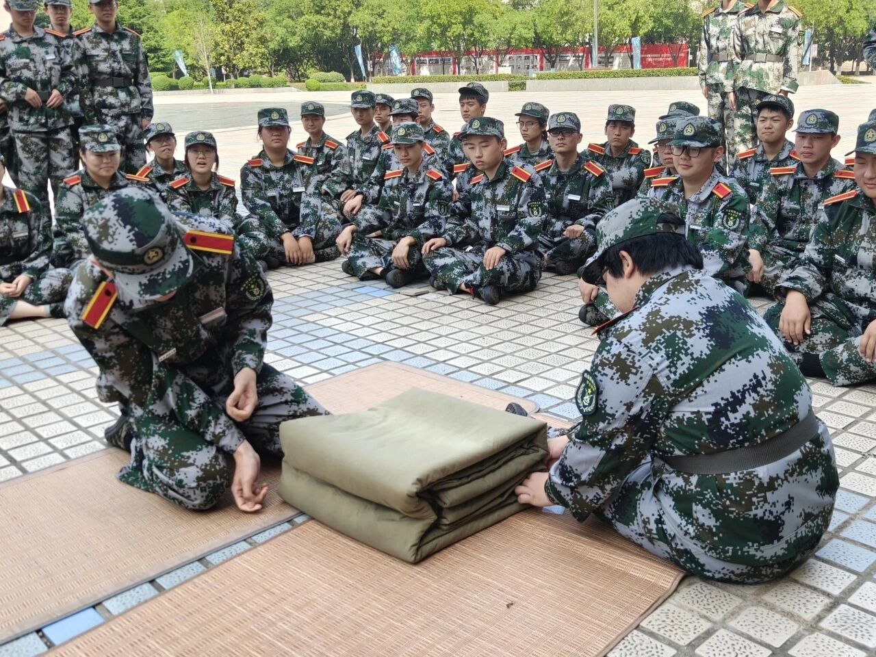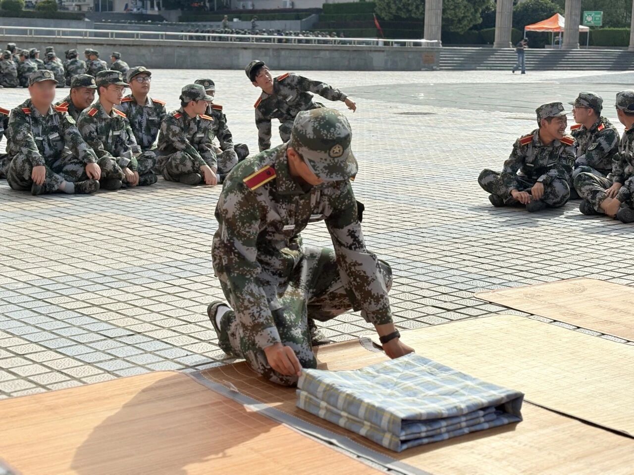 训练场上,同学们认真观摩示范,随后在教官指导下进行实践操作。整个过程秩序井然,体现了同学们严肃认真的训练态度。本次内务整理训练是新生军训计划中的重要环节,通过具体的生活技能培训,培养同学们的自律能力和严谨作风。