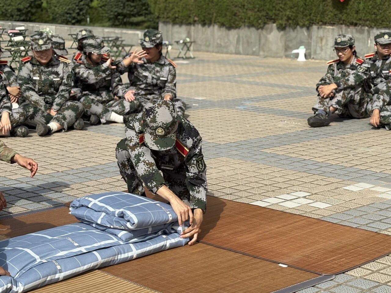 教官首先进行了完整的叠被示范。从铺平被子、精确测量尺寸到折叠成型,每个步骤都展现着标准化、规范化的操作流程。一床松软的棉被在教官娴熟的操作下,很快转变为棱角分明的"豆腐块",其挺括的线条和平整的表面令人印象深刻。