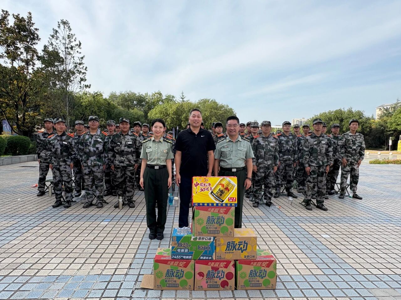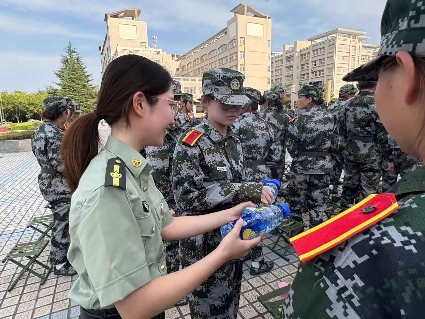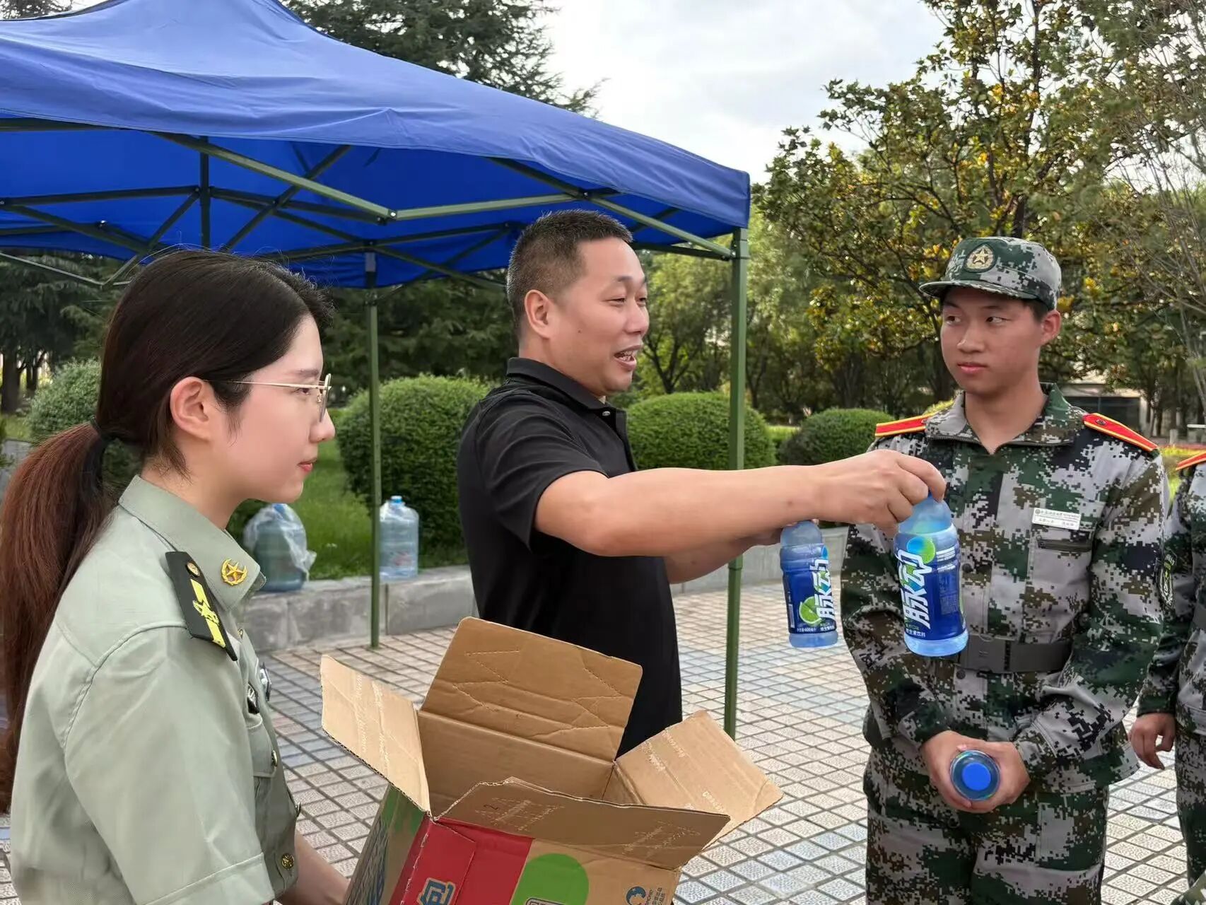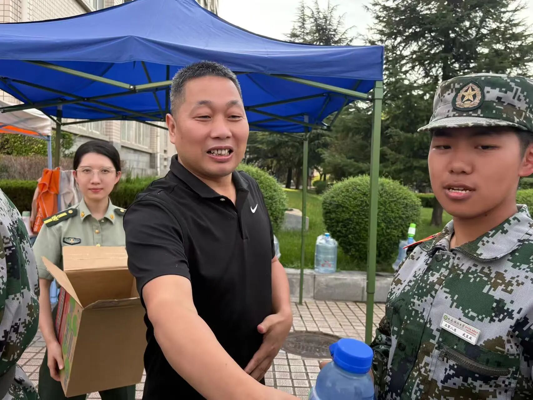 慰问过程中,老师们一同将精心准备的清凉解暑饮料逐一发放到每一位新生和教官手中。一箱箱清凉的饮品不仅消解了训练的疲惫,更传递了学院大家庭的温暖与关爱。同学们脸上洋溢着喜悦的笑容,纷纷表示感谢学院的关心,一定不辜负领导老师的期望,刻苦训练,磨砺自我,交出一份优异的军训答卷。