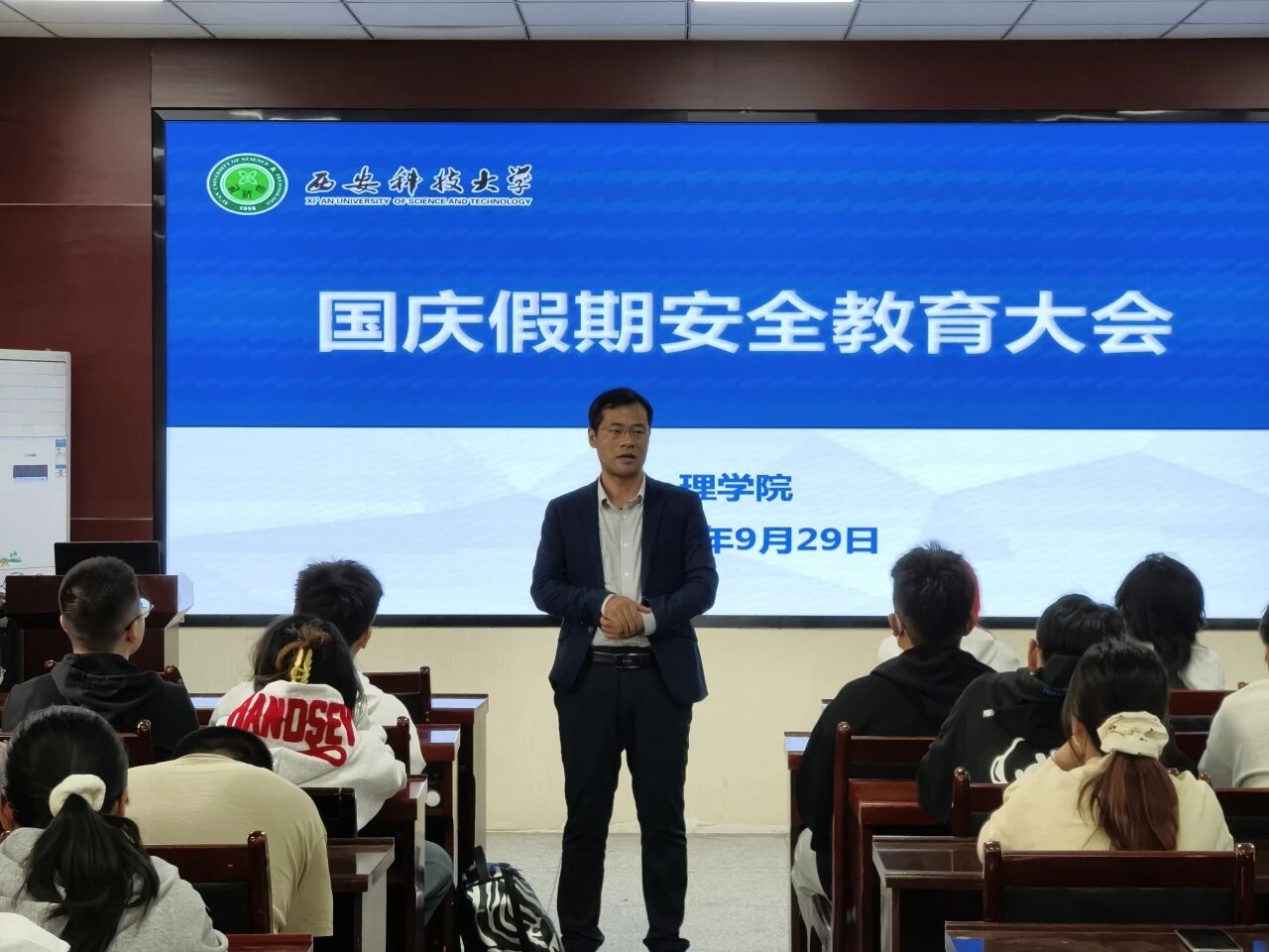 为切实做好国庆长假期间的学生安全稳定工作,增强学生的安全防范意识,确保全体学生度过一个平安、愉快的假期,9月28日及29日,AC米兰中文分批次于220会议室组织召开了国庆假期安全教育会。会议由2022级辅导员侯斌刚主讲,2022级全体本科生参会。